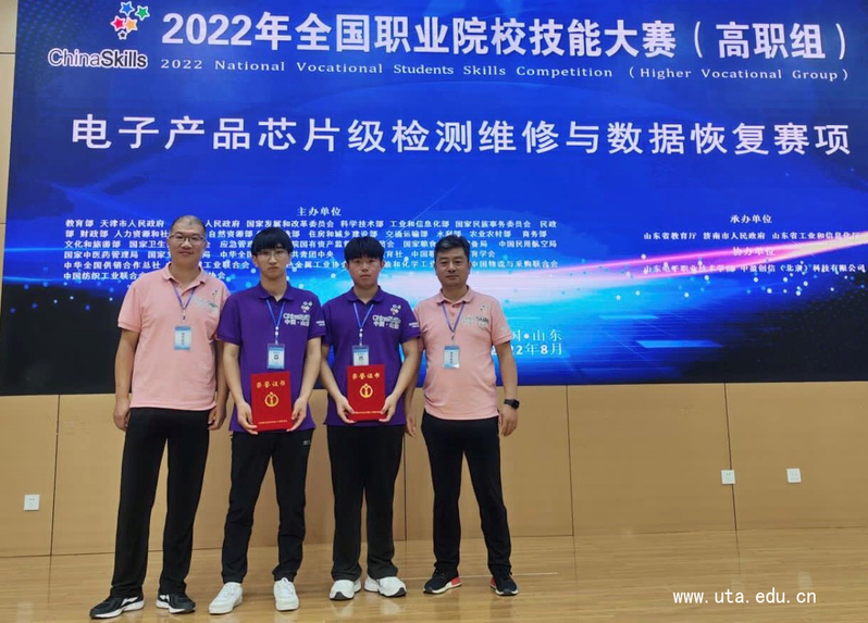 本网讯(计算机与信息技术学院通讯员 杜江淮)8月24至25日,全国职业院校技能大赛(高职组)“电子产品芯片级检测维修与数据恢复”赛项在山东电子职业技术学院举行。计算机与信息技术学院、智能制造学院学子李欢、左迎新同学在杜江淮、马卫民两位老师的精心指导下,不畏苦累、奋勇拼搏,最终取得了全国三等奖的好成绩。