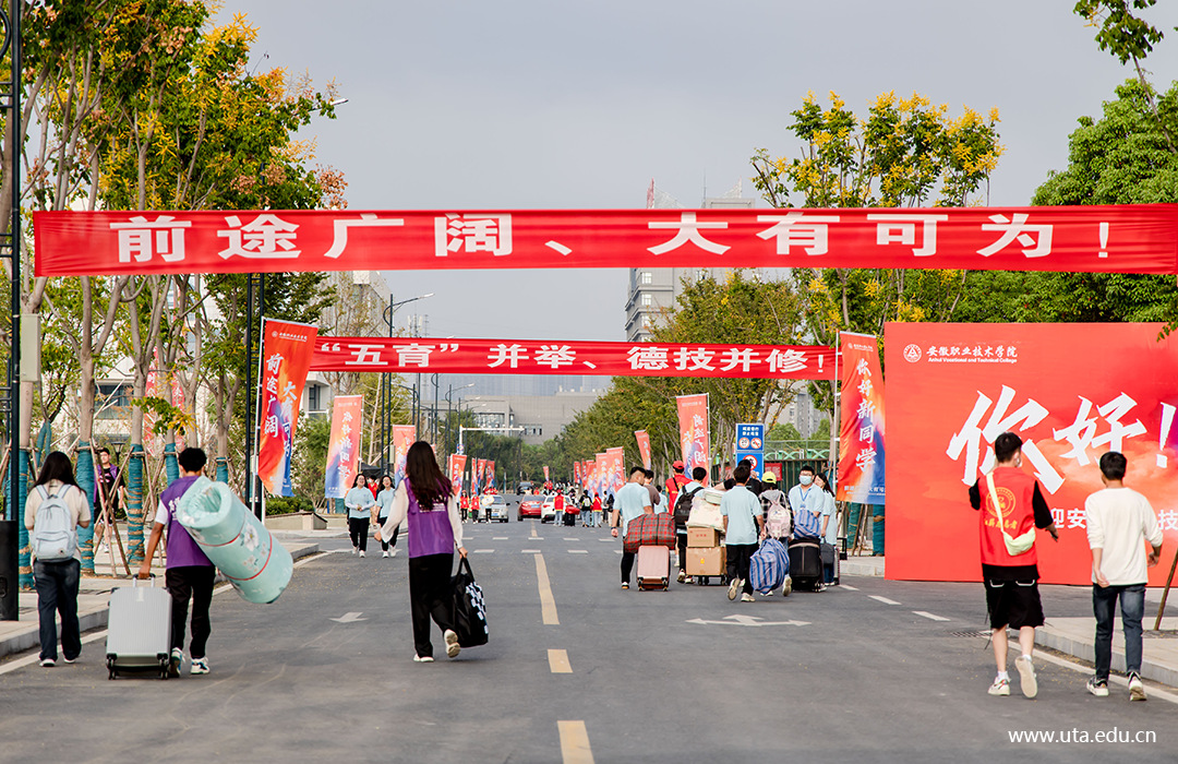 校园里人声鼎沸,“你好!新同学”“前途广阔、大有可为”“在青春的赛道上跑出最好的成绩”……等标语格外醒目,诉说着对新同学的欢迎和期待;热情的志愿者们接过新同学手中的行囊,帮助他们完成报到手续并护送他们入住宿舍,为新同学送上一份属于安职人的温暖。