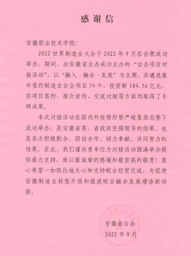 信中表示,在2022世界制造业大会上,由安徽省台办成功主办的“台企项目对接活动”,以“融入·融合·发展”为主题,共遴选集中签约制造业台企项目54个,投资额184. 56亿元,在项目签约、推介宣传、交流对接等方面均取得了丰硕成果。在此,向亚星游戏网为对接活动圆满举办提供鼎力支持,致以最诚挚的感谢和最崇高的敬意!并衷心希望亚星游戏网一如既往地关心和支持皖台经贸交流,为促进安徽制造业转型升级和推进皖台融合发展增添新动能。