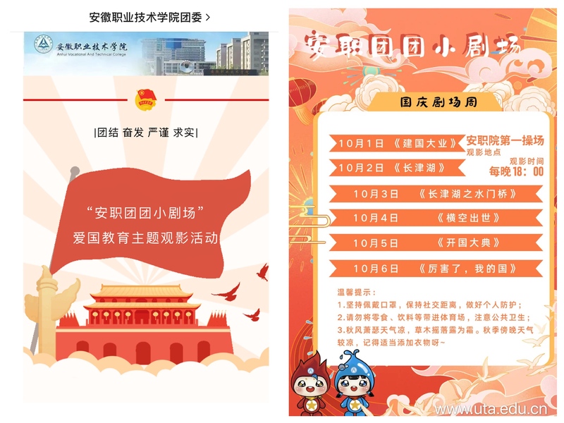 “我和我的祖国,一刻也不能分割……”团委组织各二级学院团总支书记、团学干部代表、各特色社团同学们共同录制《我和我的祖国》红歌视频,全体师生挥舞着手中鲜艳的五星红旗,在书声琅琅的的图书馆前,在碧波荡漾的清水湖畔,在温情浪漫的“I ❤ UTA”宣传标识下,以最饱满的热情,唱响心中情怀。视频同期被安徽共青团转载,这种质朴而热烈的告白方式凝聚着安职师生对祖国母亲深深的祝福。