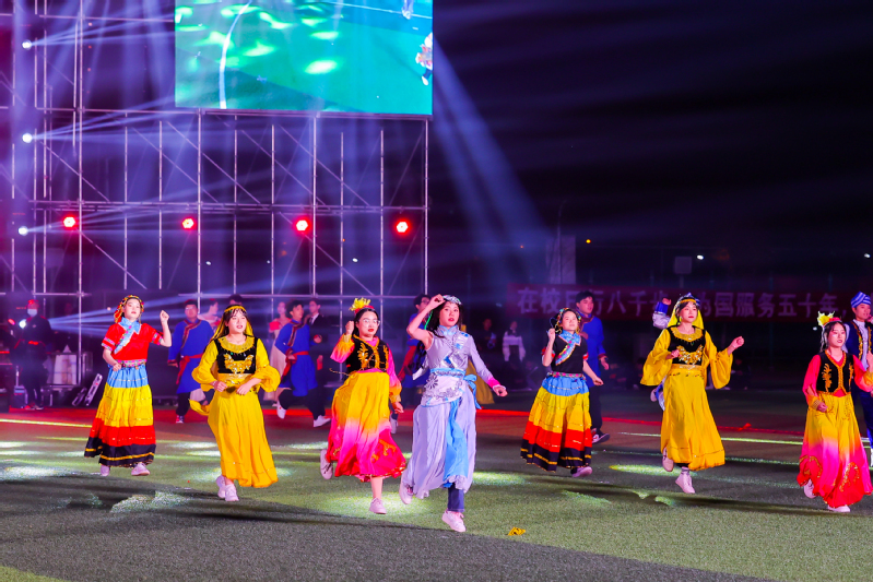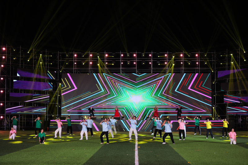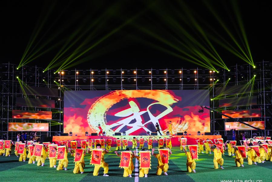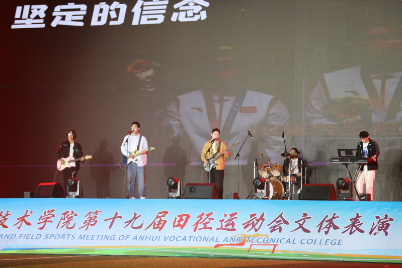 大气质感的舞台线条构造出恢弘的视觉景观,运用超高清LED屏幕显示、直播投影、无人机拍摄等科技手段,助力导演组、演职人员,为全体师生带来了一场文艺和体育融合的视觉盛宴。青春如花,生命因运动而绽放!竞技似火,人生因拼搏而辉煌!由团委大学生艺术团选送的乐队表演《青春之火》正式拉开了文体表演的序幕,动感的音乐、独特的嗓音瞬间点燃了现场的气氛。