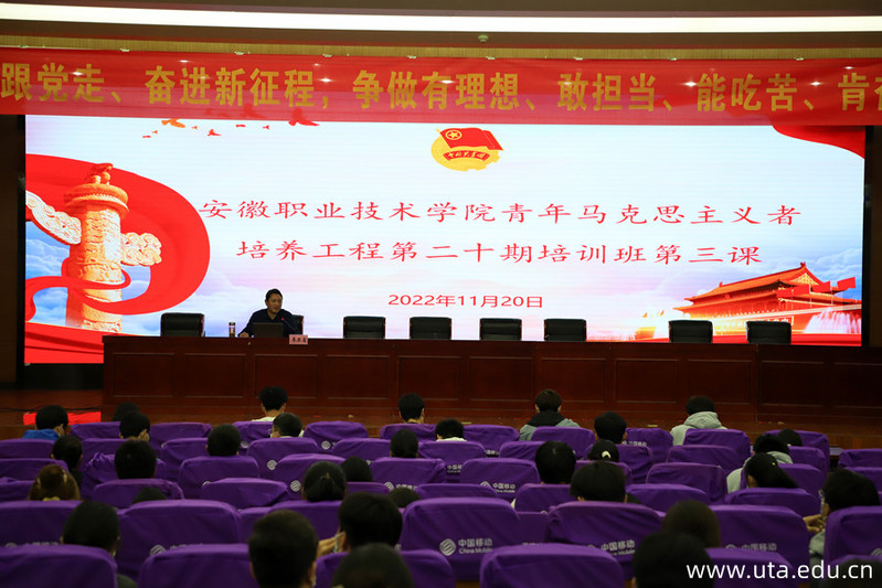 本网讯(团委通讯员 范海宁 张庚晨)为深入学习宣传贯彻党的二十大精神,教育引领广大团员青年学生努力成长为忠诚可靠的青年马克思主义者,以实际行动刻画安职学子的鲜明底色,11月20日晚,学院第二十期青马工程培训班第三讲在图文信息中心三楼学术报告厅举行。党委委员、纪委书记李荣富为学员们上了一堂题为“感悟经典魅力,把握新时代发展脉搏—— 《共产党宣言》及其当代价值”的思政课。团委负责人贾亮亮、专职团干以及青马班学员共200余人参加了学习培训。