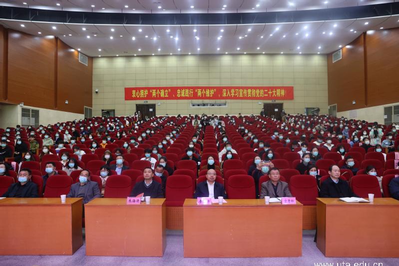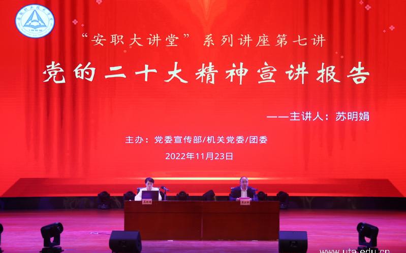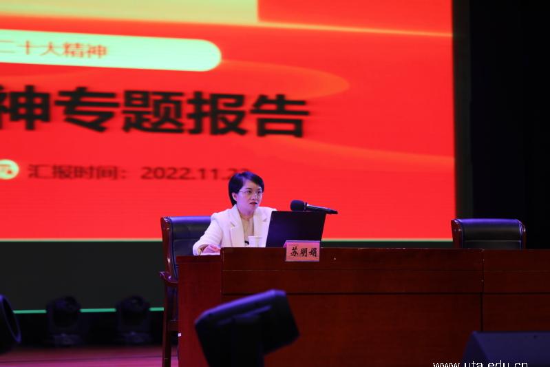 本网讯(党委宣传部通讯员 孙涛)为迅速兴起学习宣传贯彻党的二十大精神热潮,引导学院广大师生把思想统一到党的二十大精神上来,根据省直机关工委统一部署,11月23日下午,党的二十大代表、工商银行省行人力资源部总经理助理、团省委兼职副书记、希望工程的“大眼睛”苏明娟面向学院师生深入宣讲党的二十大精神。院党委书记李方泽,党委委员、副院长宣岩松,党委宣传部、机关党委、团委负责人及各二级学院党总支书记、团总支书记,学生团干、青马班学员等参加报告会。