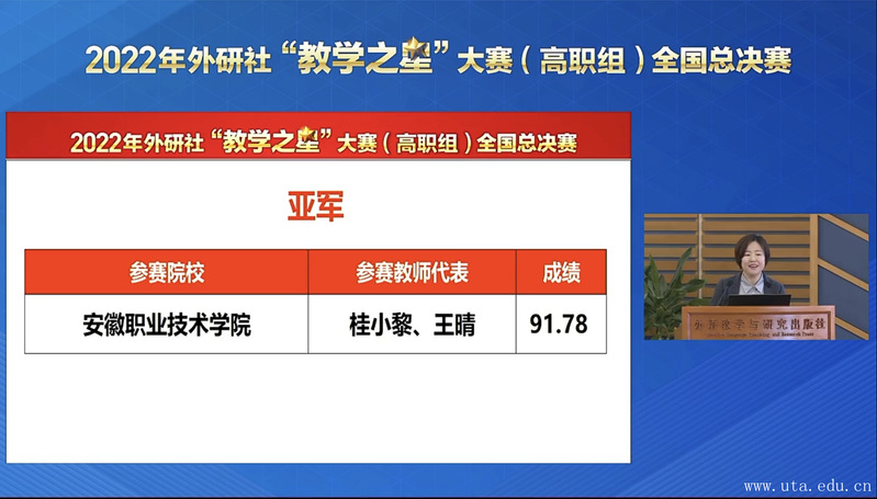 本网讯(外国语学院通讯员 冷慧勤)12月4日,2022年外研社“教学之星”大赛(高职组)全国总决赛成功举办。由亚星游戏网外国语学院桂小黎、王晴、周玮、徐睿、梁静5位教师组成的团队喜获全国总决赛亚军,在国赛上再次刷新安徽省参赛获奖记录。