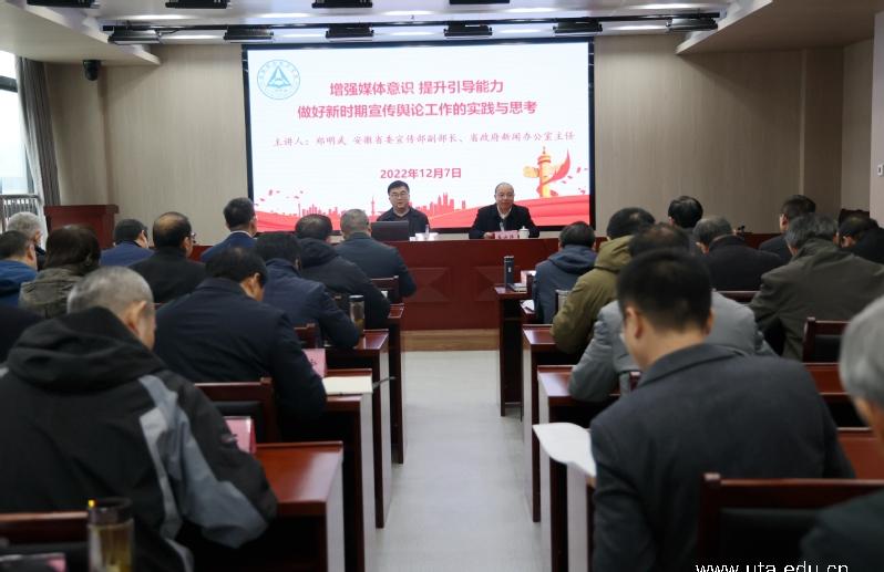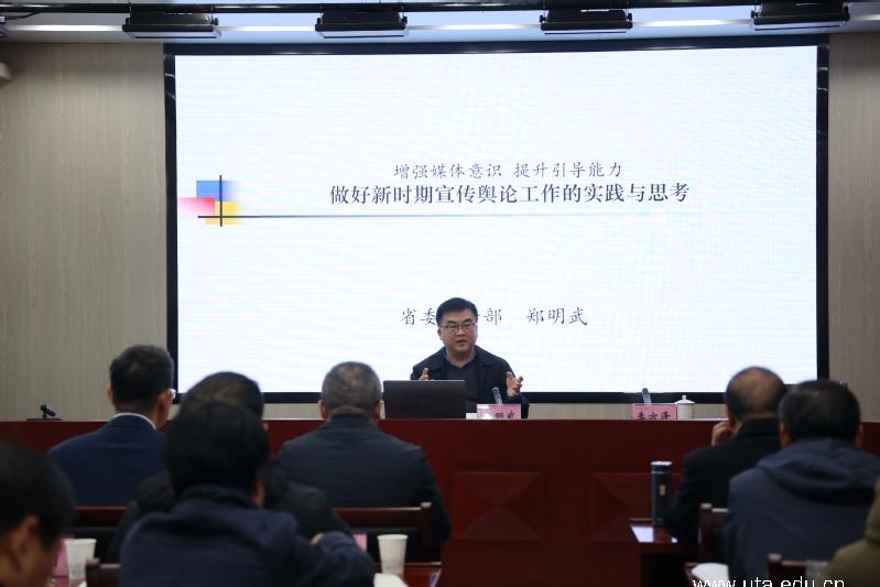 本网讯(党委宣传部通讯员 叶惠玲)为深入学习宣传贯彻党的二十大精神,落实好习近平总书记关于宣传舆论工作的重要论述,12月7日上午,学院特邀省委宣传部副部长、省政府新闻办公室主任郑明武在至公楼三楼视频会议室作《增强媒体意识 提升引导能力 做好新时期宣传舆论工作的实践与思考》主题宣讲报告。党委书记李方泽主持会议,学院领导班子成员,组织员、教学督导,各部门主要负责人、各二级学院党政主要负责人参加会议。