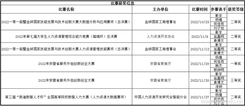特殊的网络赛形式,对参赛团队是一种全新的挑战,提出了更高的要求。在学院领导的大力支持下,人力资源管理专业教学团队快速响应,制定出一套行之有效的线上备赛方案。经过精心准备,校内线上选拔等环节,最终突围省赛,挺进全国总决赛。10月23日,由金砖国家工商理事会主办的2022“一带一路”暨金砖国家技能发展与技术创新大赛大数据分析与运用赛项总决赛中,靳宇、杨情、何佳雨、刘子怡四位同学喜获二等奖的优异成绩。11月6日,由人力资源开发协会主办的2022年第七届大学生人力资源管理综合能力竞赛总决赛,经激烈角逐,靳宇、翁嘉明、袁博文三位同学获得团队二等奖的好成绩。11月12日,由金砖国家工商理事会主办的2022“一带一路”暨金砖国家技能发展与技术创新大赛之人力资源管理技能赛项国内赛总决赛中,靳宇、翁嘉明、袁博文三位同学获得团队二等奖的好成绩。 11月20日,由安徽省教育厅主办的2022年安徽省服务外包创新创业大赛中,杨情、何佳雨、韩杰、班钟明、柏圆圆五位同学喜获团队一等奖的好成绩;靳宇、翁嘉明、袁博文、凌玥四位同学喜获三等奖。11月27日,第三届“新道数智人才杯”全国高等院校数智人力大赛中,靳宇、杨情、何佳雨、刘子怡三位同学获得二等奖。