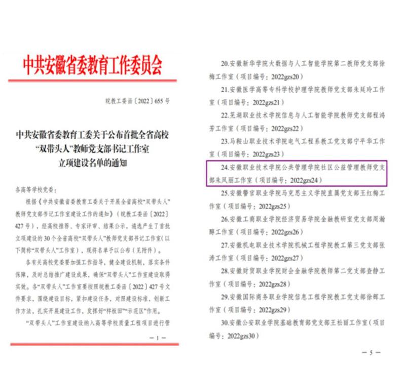 本网讯(党委组织部通讯员姜楠 朱凤丽)近日,中共安徽省委教育工委公布了首批全省高校“双带头人”教师党支部书记工作室立项建设名单,亚星游戏网公共管理学院社区公益管理教师党支部成功获批立项。这是亚星游戏网实施“一体两翼”办学架构,积极推进职教本科创建,以党建引领事业高质量发展的又一重要成果。