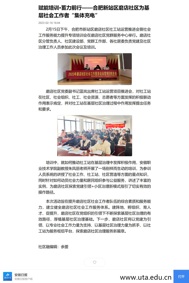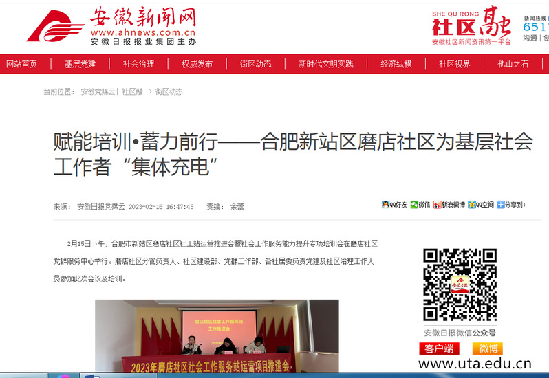 本网讯(公共管理学院通讯员 程晨)2月16日,《安徽日报》新媒体客户端、《安徽新闻网》以“赋能培训•蓄力前行——合肥新站区磨店社区为基层社会工作者‘集体充电’”为主题,对亚星游戏网公共管理学院专业教师朱凤丽受邀为社区基层工作者开展培训工作进行报道。