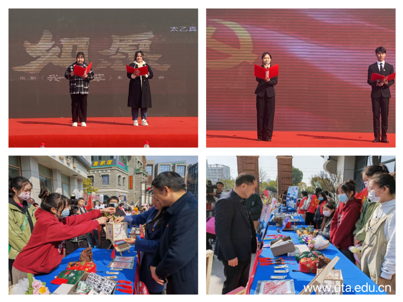在随后的文艺汇演中,公共管理学院选送的朗诵《党旗颂》和对唱《如愿》,展现出世代中国人的奋斗与传承,赢得了现场热烈的掌声;文化与旅游学院会展专业的同学们以“文以化人、旅以载道”为展览主题,向现场领导、嘉宾和观众展示安徽传统文化作品,获得一致好评。