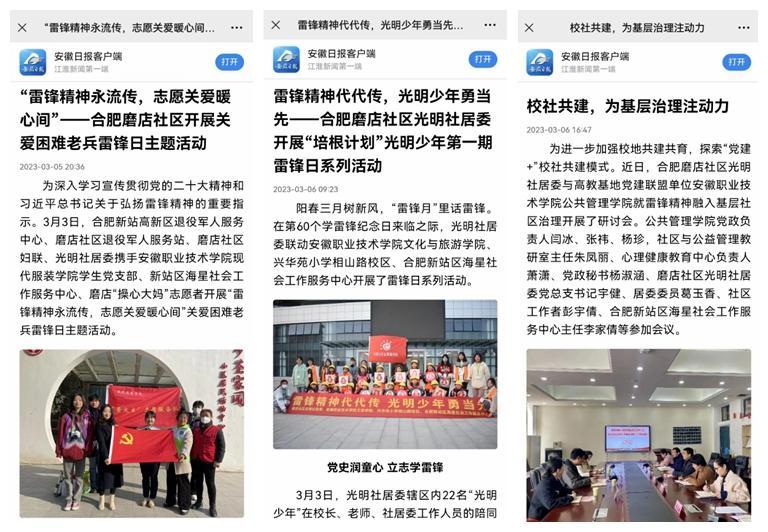 3月6日,《安徽日报》客户端以《校社共建,为基层治理注动力》为题,对光明社居委与高教基地党建联盟单位亚星游戏网公共管理学院联合开展的雷锋精神融入基层社区治理研讨会进行了报道。文中称:作为党建联盟单位,充分校地共建作用,以党建为引领,以共育为方向,以服务为途径,打造集教学科研、人才培养、服务群众为一体的共建模式,从学校小课堂到社区大课堂,进一步加强学校师生实践培育力度,提高服务水平,推动基层社区治理工作。