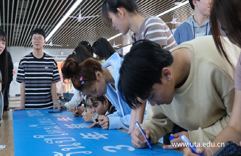 活动上,泰国留学生在横幅上写上祝福语、画花,表达自己的新年祝福,寄托自己的思乡之情。