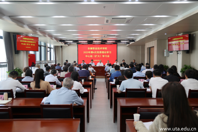 本网讯(党委宣传部通讯员 胡骏 赵邵华)4月20日上午,学院在至公楼三楼视频会议室召开2023年第4次党委理论学习中心组(扩大)学习会。会议集中学习了全国两会精神,学习了习近平总书记在学习贯彻习近平新时代中国特色社会主义思想主题教育工作会议上的重要讲话精神、中共中央办公厅《关于在全党大兴调查研究的工作方案》、安徽省学习贯彻习近平新时代中国特色社会主义思想主题教育动员大会会议精神、中共安徽省委办公厅《关于在全省大兴调查研究的实施方案》,传达学习了保密工作和意识形态有关文件精神等。党委书记李方泽主持会议,学院党委领导班子成员,组织员、教学督导,各部门主要负责人、各二级学院党政主要负责人参加会议。