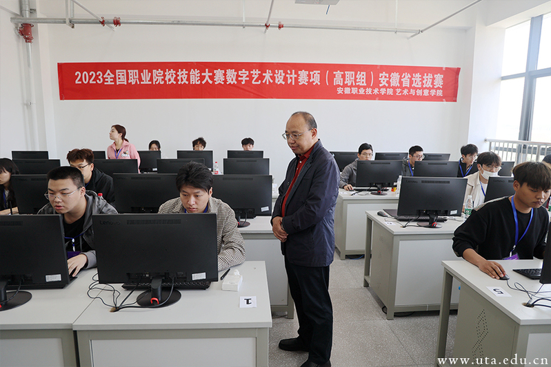 本网讯(艺术与创意学院通讯员 朱信信)5月7日,2023年全国职业院校技能大赛(高职组)安徽省选拔赛 “数字艺术设计”赛项在艺术与创意学院举行。来自省内的15所高职学校45名选手、15个领队老师参加了本次比赛。本次数字艺术设计安徽省选拔赛得到院领导的高度重视和大力支持,党委书记李方泽,党委副书记、院长盛鹏,党委委员、副院长张智清,党委委员、副院长杨林国,党委委员、副院长宣岩松,党委委员、纪委书记李荣富,督导员林葆春来到现场观摩指导,并与大赛专家裁判及参赛领队老师展开交流。