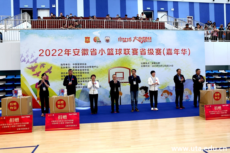 赛前,安徽省篮球协会在体育馆举行了捐赠篮球运动器械仪式,4所受捐赠单位阜阳市阜南县王家坝中心学校、六安市金寨县大湾村小学、宣城市泾县云岭镇中心小学和滁州市凤阳县小岗村小学出席了捐赠仪式。出席仪式的领导分别向4所学校捐赠本次活动的八台球架、八箱篮球和书籍物资。