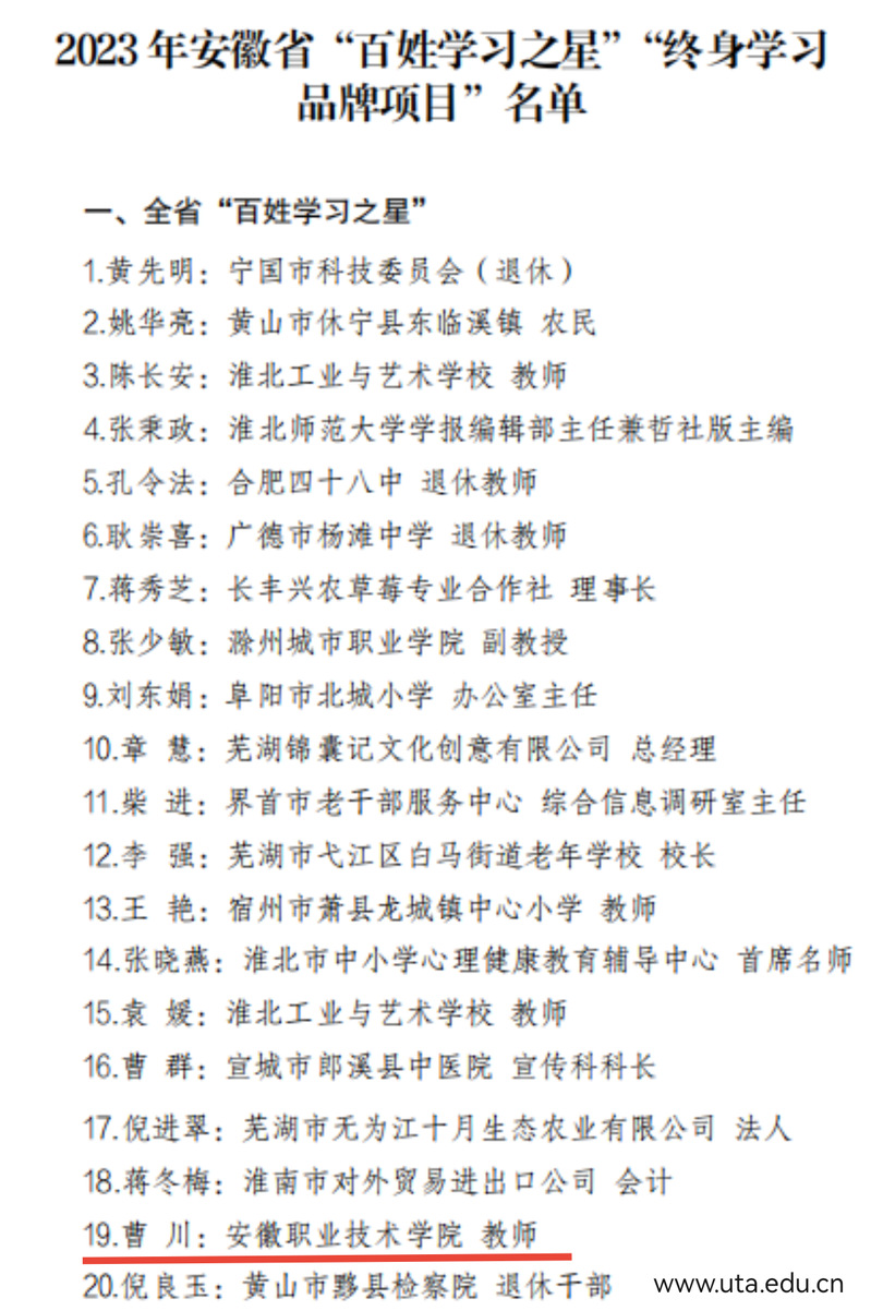 本次“百姓学习之星”和“终身学习品牌项目”是根据《安徽省教育厅关于做好2023年全省新时代“百姓学习之星”和“终身学习品牌项目”宣传推介工作的通知》,经过各地教育行政部门推荐、省级专家评审和公示,确定了黄先明等20名同志为2023年安徽省“百姓学习之星”,确定了安徽老年远程教育示范基地等20个单位为安徽省“终身学习品牌项目”。