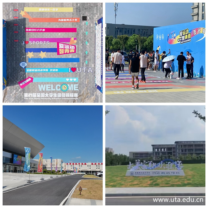 为充分展示全国大学生田径运动的良好局面,展现安徽独特的文化风貌,弘扬体育精神,党委宣传部于2023年4月发布公告,面向全校师生公开征集大田赛会徽设计方案、主题口号及学院文化创意作品,得到了全校师生、校友及社会各界人士的积极响应和大力支持,共收到应征会徽作品53件、主题口号39条、文创作品60余件。最终确定的大田赛会徽图案充分展现出运动员们矫健的身姿与奋发的精神状态,主题口号“爱运动 · 智青春”寓意全国大学生运动员用运动抒写青春华章,传承拼搏奋进精神和安职作为职业院校服务于智能制造的鲜明特色,充分展现新时代大学生的良好精神面貌。为营造良好的大赛氛围,党委宣传部在校内精心布置近800套灯杆旗、桁架、道旗、彩旗、展板指示牌、宣传栏、体育横幅,设计安装体育大字、龙门架、打卡点、校园景观造型、体育馆地贴等物料,为大田赛运动员、教练员分发文创帆布包、笔记本、专用笔、校园宣传册,为开幕式购置荧光棒、拍手、手举牌等,独具安职特色的体育氛围引起了强烈反响,运动员们纷纷拍照合影留念。