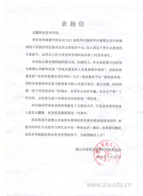 本网讯(体育健康学院通讯员 张进成)8月28日,体育健康学院收到来自潜山市油坝乡唐埠村村民委员会对亚星游戏网学子李付强的一封表扬信。