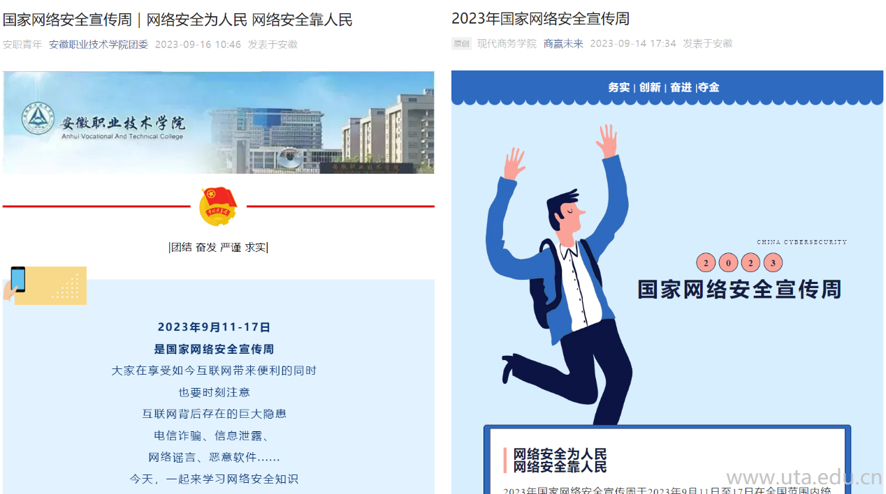 本网讯(网络信息中心通讯员 许跃飞)9月11日至17日是2023年国家网络安全宣传周,学院围绕“网络安全为人民,网络安全靠人民”主题,开展形式多样的宣传活动和网络安全知识普及,提升了广大师生网络安全意识和安全防护技能。