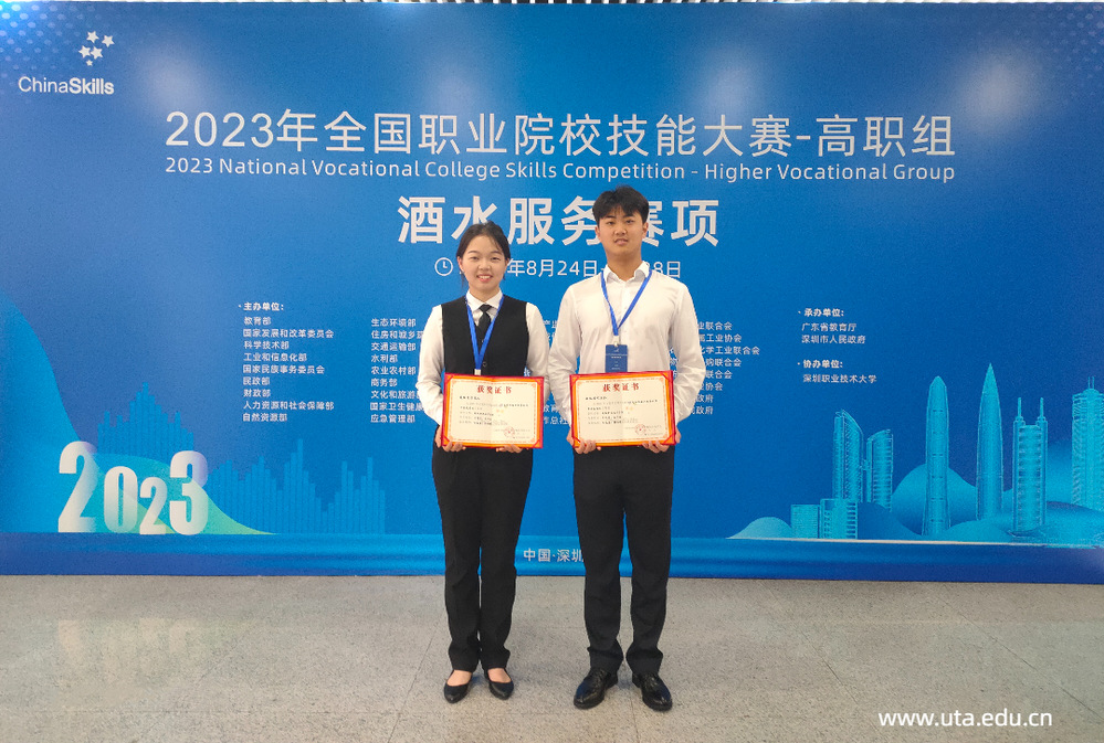 本网讯(文化与旅游学院通讯员 季晓雪)2023年全国职业院校技能大赛高职组“酒水服务”赛项学生赛在深圳职业技术大学举行。来自全国60所高职院校120名参赛选手同台切磋技艺。在亚星游戏网文化与旅游学院季晓雪、韩玮玮老师指导下,经过五天激烈角逐,牛倩倩、孙万淋同学发挥出色,荣获全国三等奖。