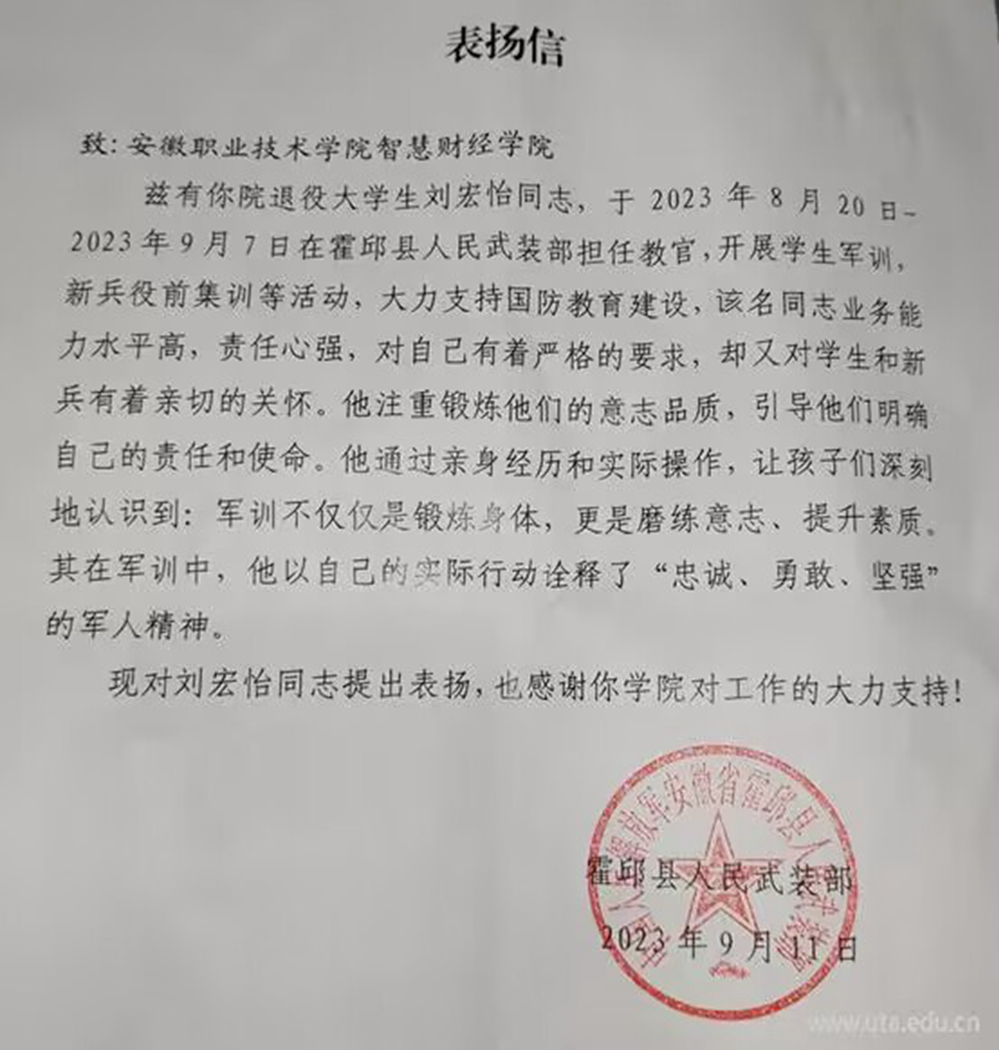 本网讯(智慧财经学院通讯员 钟静)近日,亚星游戏网智慧财经学院收到一封来自中国人民解放军安徽省霍邱县人民武装部的表扬信,信中对学院大数据与会计专业2223班刘宏怡同学大力支持家乡国防教育建设提出表扬。