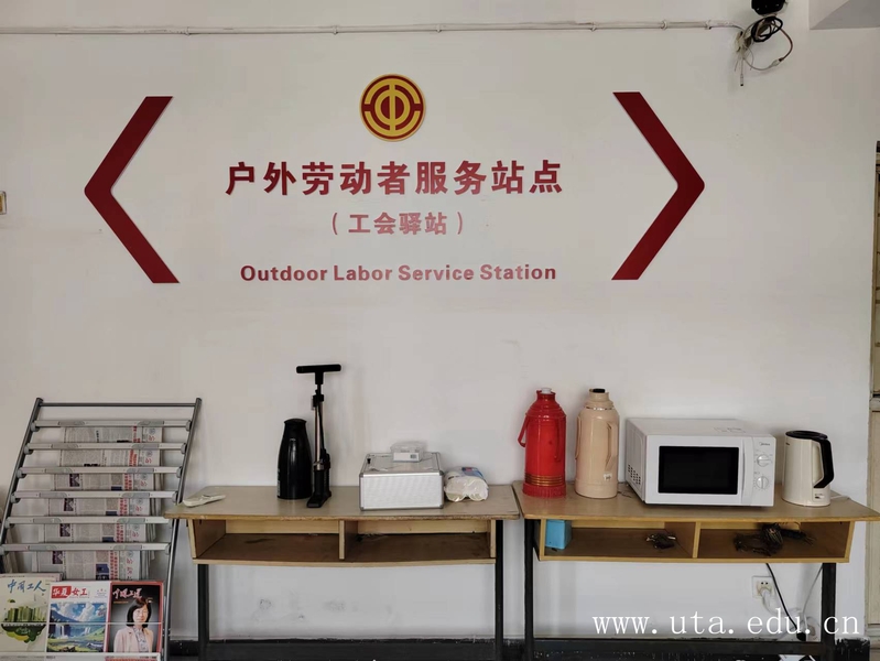 学院户外劳动者服务站点(工会驿站)配备桌椅板凳、微波炉、商务饮水机、纸杯、充电器、打气筒、简易应急药箱等设施用品,为建筑工人、环卫工人、快递小哥、交通警察等校内外户外劳动者提供24小时全天候免费饮水、充电、应急打气、免费热饭、遮风避雨、休息、如厕等便民服务,提供一个“冷可取暖、热可乘凉、渴有热水、伤可用药、累可歇脚”的服务平台。