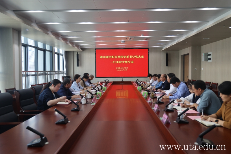 本网讯(办公室通讯员 苏悦)10月19日,滁州城市职业学院党委书记张志华一行来院考察交流。院党委书记李方泽,党委委员、纪委书记李荣富出席会议,相关部门及二级学院负责同志参加会议。会议由李方泽主持。