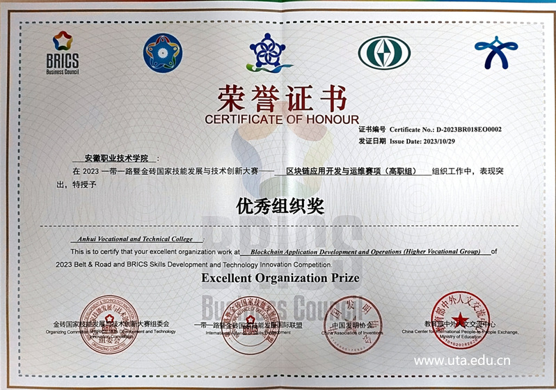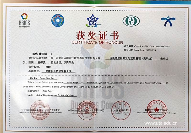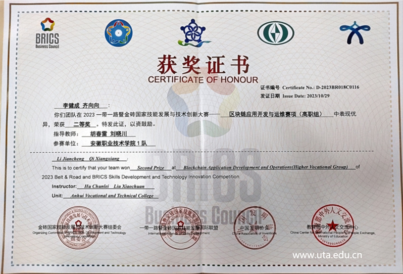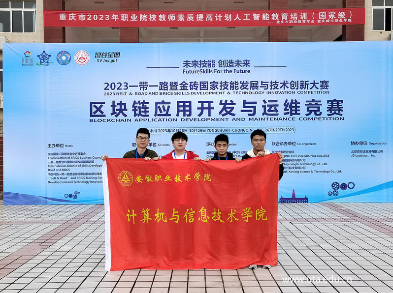 本网讯(计算机与信息技术学院通讯员 周润民 )10月29日,2023一带一路暨金砖国家技能发展与技术创新大赛“区块链应用开发与运维竞赛”在重庆城市职业学院落幕。来自国内外的115支队伍同台竞技,经过激烈角逐,亚星游戏网派出的两支代表队分别获得二等奖、三等奖,学院获得优秀组织奖。