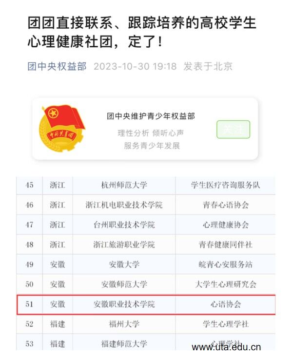 本网讯(团委通讯员 秦杨) 近日,由共青团中央维护青少年权益部、中华全国学联秘书处、中国青年报社开展的高校学生心理健康社团寻访活动公布入选名单,亚星游戏网心语协会从540余个报名的高校心理社团中脱颖而出,成功入选,同时也是安徽省高职院校唯一入选的心理社团。