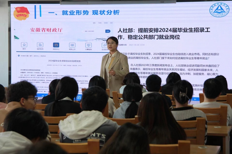 招聘会现场秩序井然,毕业生们手持简历,积极与企业招聘人员交流。在招聘会开展的同时,“简历义诊专区”的知名人力资源专家免费为大学生诊断简历,开展简历辅导。安徽省“启明星”就业指导专家、艺术与创意学院辅导员贾佳为毕业生作《踏路前行 “职”击未来》主题报告,为毕业生带来更全面就业指导服务。