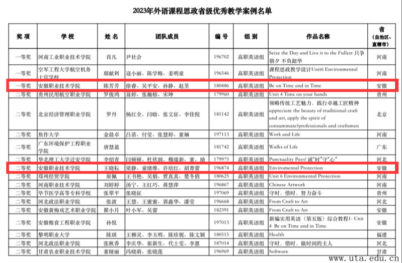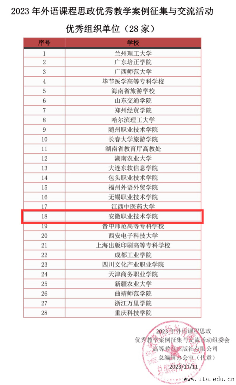 本网讯(外国语学院通讯员 冷慧勤 陈芳芳)日前,由教育部职业院校外语类专业教学指导委员会与高等教育出版社联合主办的“2023年外语课程思政优秀教学案例全国交流活动”落下帷幕。亚星游戏网获得优秀组织奖。外国语学院两支教师团队斩获佳绩,其中陈芳芳教师团队获安徽省赛区一等奖,王晓耘教师团队获安徽省赛区二等奖。