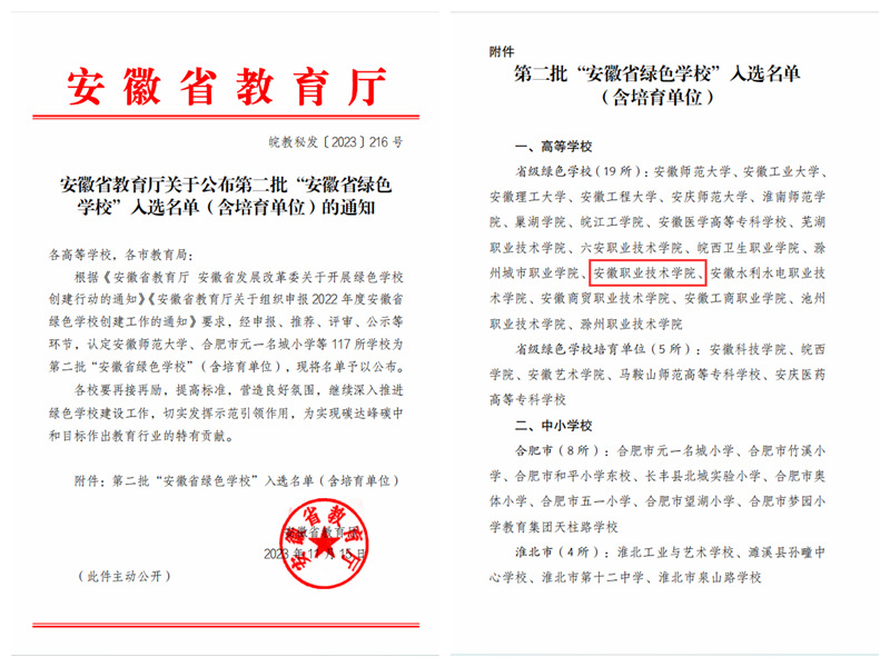 本网讯(党委宣传部通讯员 宋莹蕊) 近日,安徽省教育厅公布第二批“安徽省绿色学校”入选名单(含培育单位),我校成功入选第二批“安徽省绿色学校”。