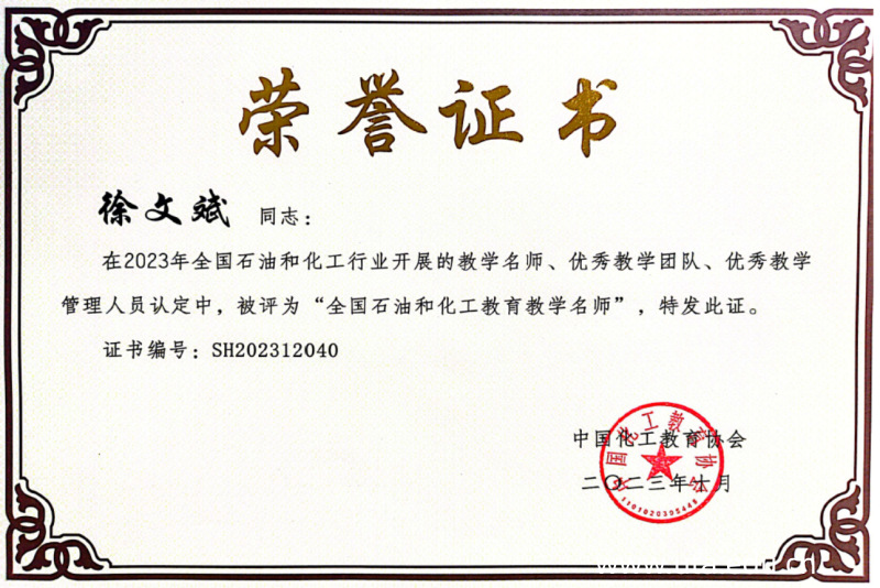 本网讯(环境与生命健康学院通讯员 张晓晴)12月9日,中国化工教育协会年会为2023年全国石油和化工教育教学名师、优秀教学团队、优秀教学管理人员进行颁奖,亚星游戏网教师徐文斌荣获“全国石油和化工教育教学名师”称号。