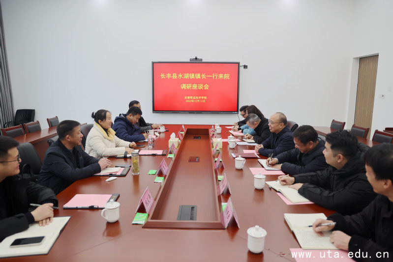 本网讯(艺术与创意学院通讯员 赵楠)12月13日,长丰县水湖镇党委副书记、镇长陈燕一行来院考察调研并开展座谈交流,院党委书记李方泽,相关职能部门负责人、艺术与创意学院党政负责人及教师代表参加座谈交流。