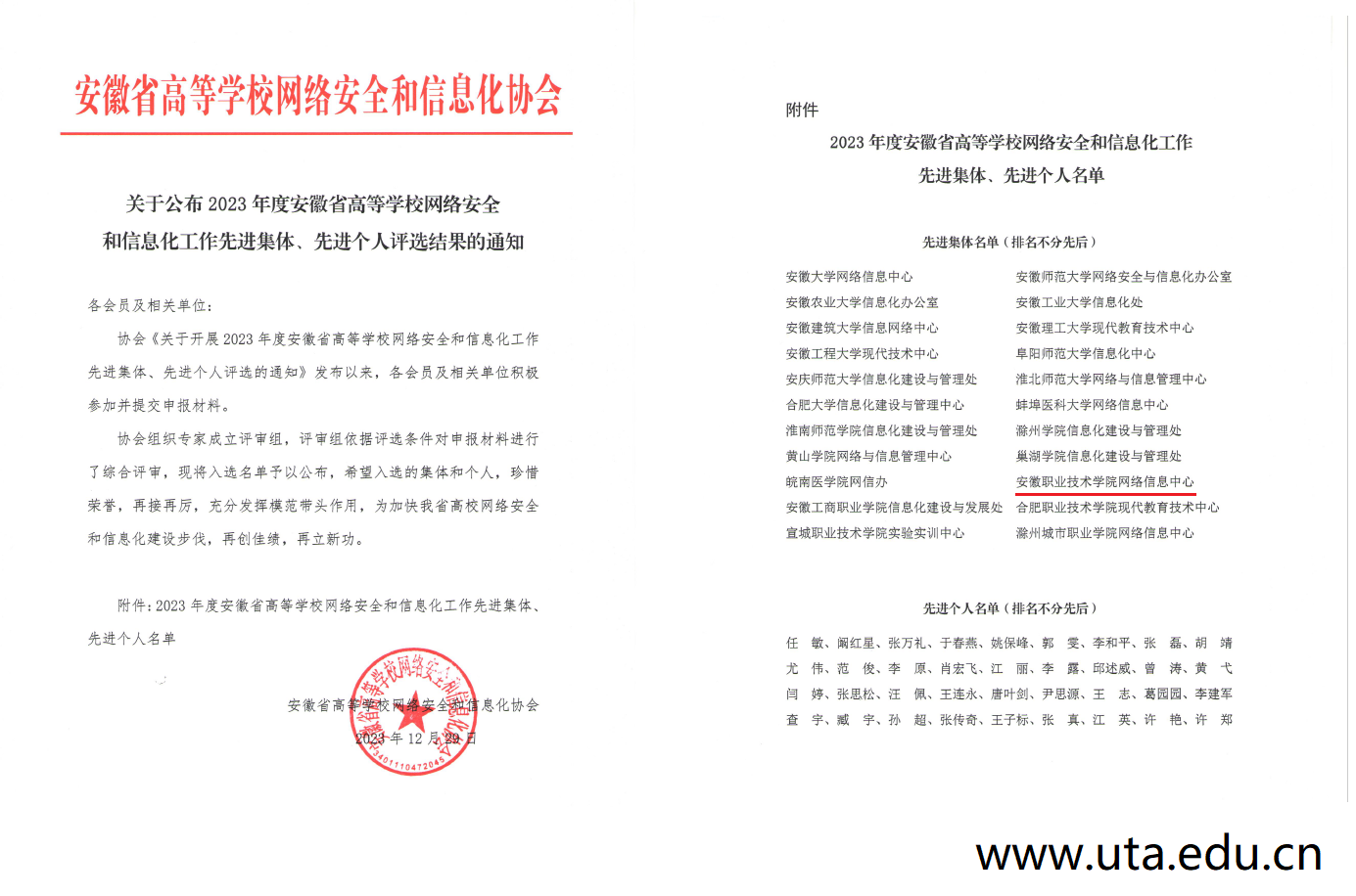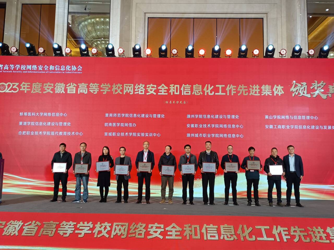 本网讯(网络信息中心通讯员 许跃飞)近日,安徽省高等学校网络安全和信息化协会发布《关于公布2023年度安徽省高等学校网络安全和信息化工作先进集体、先进个人评选结果的通知》,经过层层推荐和专家评审,学院荣获2023年度安徽省高等学校网络安全和信息化工作先进集体。