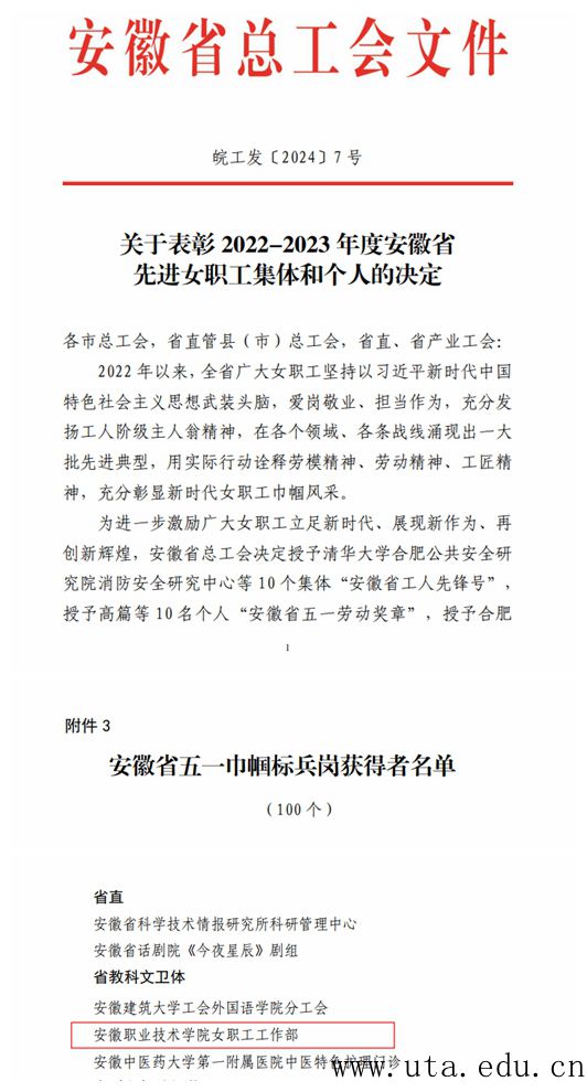 本网讯(工会通讯员 朱凤丽)3月11日,安徽省总工会下发《关于表彰2022-2023年度安徽省先进女职工集体和个人的决定》,对全省工作先进女职工集体和个人进行表彰。亚星游戏网工会女职工工作部荣获“安徽省五一巾帼标兵岗”称号,此荣誉是继学院工会荣获“安徽省教科文卫体系统工会工作先进集体”称号之后,又一省级荣誉。