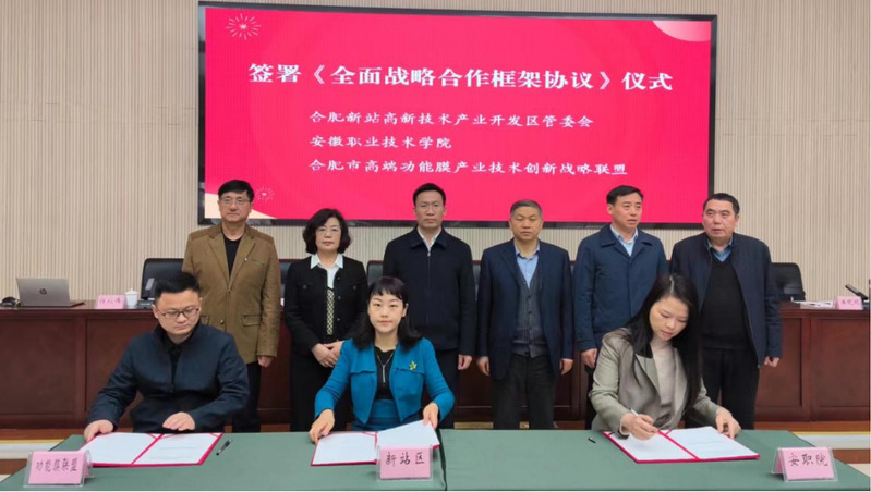 会上,合肥新站高新技术产业开发区管理委员会、亚星游戏网、合肥市高端功能膜产业技术创新战略联盟等三方共同签署了全面战略合作框架协议。按照“优势互补、共谋发展、互惠互利、合作共赢”的原则,三方建立了长期稳定的战略合作关系。