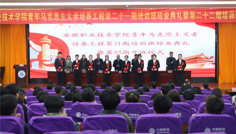 开班仪式在共青团团歌《光荣啊!中国共青团》中正式拉开序幕。会上宣读了《关于表彰第21期“青马工程”培训班优秀学员的决定》。与会领导为优秀学员颁发荣誉证书,第21期“青马工程”优秀学员代表环境与生命健康学院食品2222班陈兰兰和大家分享了自己的学习体会和收获。第22期学员代表现代商务学院电商2323班蒋旭代表全体新学员表达了努力成长为坚定的青年马克思主义者的决心。