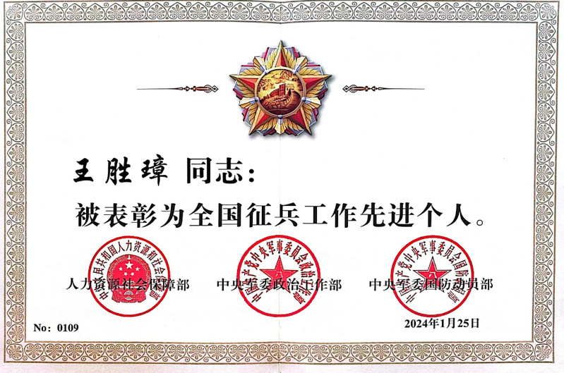 本网讯(学生处通讯员 吴丽丽)近日,2024年全国征兵工作暨表彰大会在北京召开,会议通报表彰了全国征兵工作先进单位和先进个人,王胜璋老师被人力资源和社会保障部、中央军委政治工作部、中央军委国防动员部联合表彰为“全国征兵工作先进个人”。据悉,国家部委、军委机关每5年联合表彰一批全国征兵工作先进单位和先进个人。今年,安徽省军地共12人获此殊荣,我校作为省内唯一一所高职院校获此表彰。