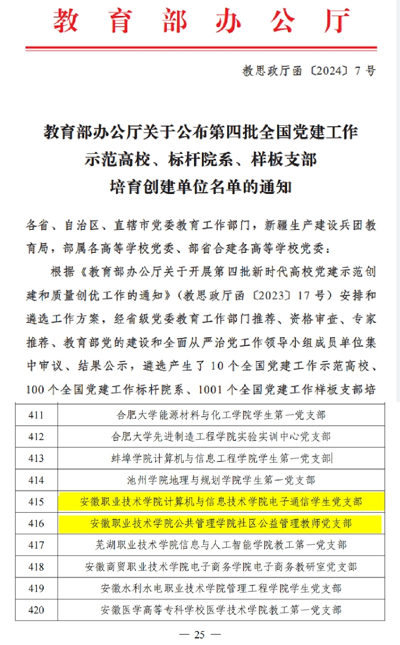 本网讯(党委组织部通讯员 刘丽丽)近日,教育部办公厅发文公布了第四批全国党建工作示范高校、标杆院系、样板支部培育创建单位名单。亚星游戏网计算机与信息技术学院电子通信学生党支部、公共管理学院社区公益管理教研室党支部入选“全国党建工作样板支部”培育创建单位。