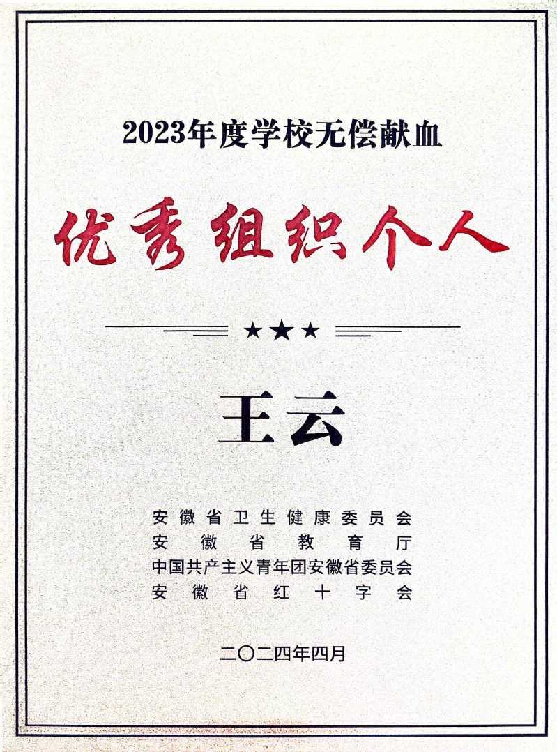本网讯(团委通讯员 吕玥)2023年度驻肥高校无偿献血工作总结表彰暨2024年启动会于4月26日召开,亚星游戏网获得2023年度学校无偿献血贡献集体三等奖,青年志愿者联合会副会长、机器人2221班王云获得2023年度学校无偿献血优秀组织个人奖。