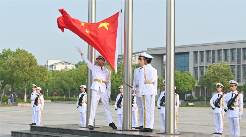 上午7时许,升旗仪式正式开始,国旗护卫队队员英姿挺拔,迈着铿锵有力的步伐,护卫着国旗走向升旗台,《义勇军进行曲》响起,扬旗手振臂扬旗,鲜艳的五星红旗在现场师生的注目礼下冉冉升起。