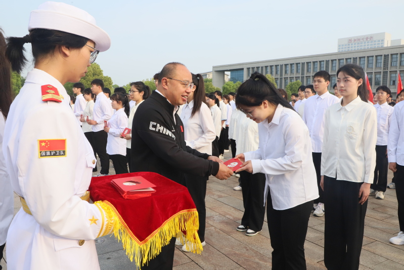 在翟裴裴、宋家琳、胡诗颖、邓少杰四位同学的带领下,全体新团员挺起胸膛、握紧右拳,面对团旗庄严宣誓。坚定的目光、紧握的拳头、铮铮的誓言,凝聚着他们青春心向党、奋进新征程的信念和决心。