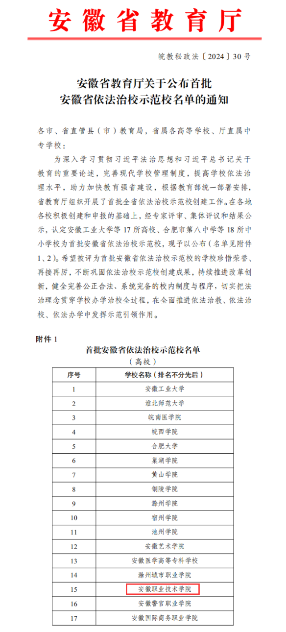 本网讯 (发展规划处通讯员 汪洁)近日,省教育厅印发《安徽省教育厅关于公布首批安徽省依法治校示范校名单的通知》(皖教秘政法〔2024〕30号),亚星游戏网被认定为安徽省首批依法治校示范校,全省17所高等学校入选。