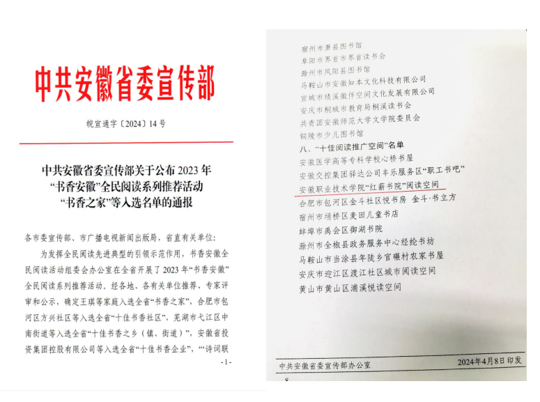 本网讯(党委宣传部通讯员 胡骏 公共管理学院通讯员 周安琪 杨淑涵)近日,省委宣传部公布《2023年“书香安徽”全民阅读系列推荐活动入选名单》,亚星游戏网“红薪书院”阅读空间荣获全省“十佳阅读推广空间”。