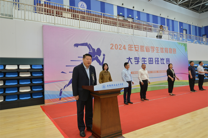本网讯 2024年安徽省学生体育联赛大学生田径比赛开幕式于5月30日在学院体育馆隆重举行。省教育厅(省委教育工委)一级巡视员解平,省体育局党组成员、副局长刘弢,学院党委书记李方泽,来自省体育局、省教育厅、省学校体育协会的领导及来自全省各高校教练员、运动员出席了开幕式,共同见证了这一体育盛事的启幕。开幕式由学院党委副书记、院长盛鹏主持。
