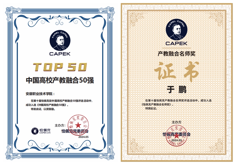 本网讯 5月29日至31日,第十届恰佩克奖颁奖仪式暨第十四届中国国际机器人高峰论坛在安徽芜湖开幕,论坛由安徽省工业和信息化厅、中国机电一体化技术应用协会和芜湖市人民政府共同主办。学院荣获恰佩克奖“中国高校产教融合50强”荣誉称号,学院教师于鹏荣获“恰佩克产教融合名师奖”。