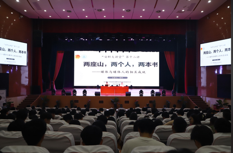 常河在至立会堂作了题为《两座山,两个人,两本书——媒体和媒体人的相互成就》的专题讲座,本次讲座也是“安职大讲堂”系列讲座第十二讲,院领导李方泽、盛鹏、宣岩松,各部门负责人、各二级学院党政负责人、专职团总支书记、新闻通讯员、青马班学员及各二级学院学生代表共计800余人到场学习。