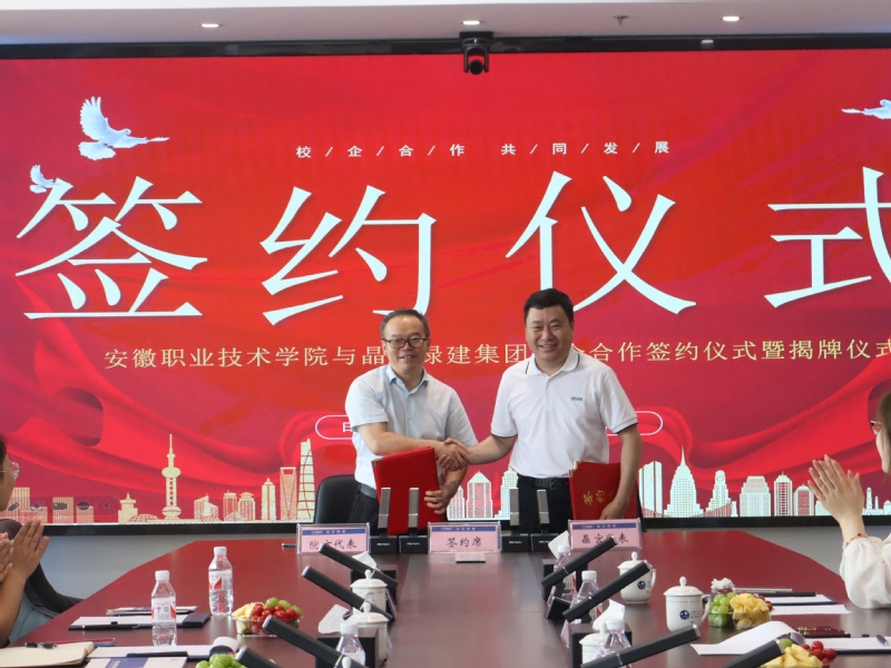 仪式开始前,盛鹏一行参观了安徽晶宫绿建集团展览馆及生产线。在交流座谈会上,安徽晶宫绿建集团董事长刘立超对盛鹏一行表示热烈欢迎并介绍了企业发展情况。盛鹏对安徽晶宫绿建集团为双方合作交流所做的工作表示真诚感谢,他指出,亚星游戏网历史悠久、特色鲜明,深耕职业教育70载,培养了各类专业技术人才,期望能够校企携手,聚焦建筑类行业发展,深化拓展与集团的全面合作,联合培养出更多能力强、适应性好的高素质技术技能人才。与会人员就学生实习就业、教师培训等相关事宜进行了充分沟通。在与会人员的共同见证下,刘立超与盛鹏共同签署了校企合作协议书。