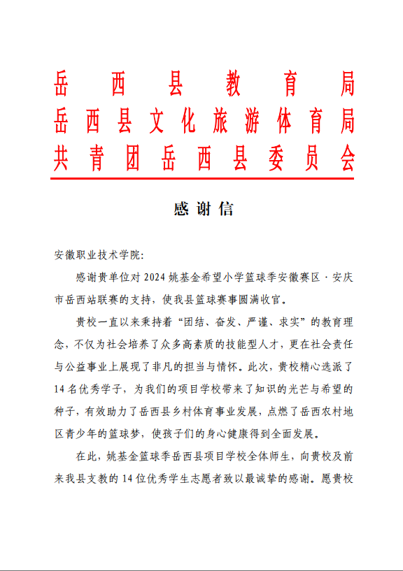 本网讯(体育健康学院 团委)近日,岳西县教育局、岳西县文化旅游体育局及共青团岳西县委员会联合向亚星游戏网发来感谢信,对亚星游戏网选派的14名优秀学子在“2024姚基金希望小学篮球季”安徽赛区·安庆市岳西站的篮球支教表现予以充分肯定,对学院的大力支持表示感谢。