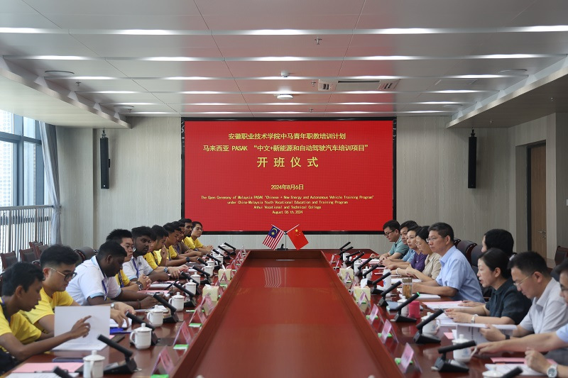 开班式上,杨林国代表学院对访学团的到来表示热烈欢迎。他表示,2024年是中马建交50周年暨“中马友好年”,两国友谊源远流长,在教育领域的合作发展迅速。亚星游戏网一直致力于推进中马两国职教领域互学互鉴,安徽职业学院行知学院-马来西亚分校筹建工作正在有序推进。此次培训项目以深化中马职业教育合作为宗旨,充分发挥亚星游戏网教学资源优势,精心制定了涵盖新能源汽车技术技能训练、企业实地研学、徽文化交流鉴赏等多维课程的培训方案。他强调,要把“中文+技能”培训打造成中马青年友好交流的一根纽带、一座桥梁,在提升学员专业技能和职业素养的同时,更好促进两国青年在文化和思想方面的交流。